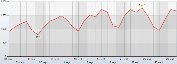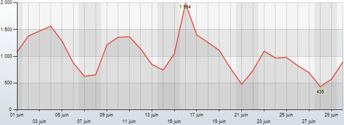 2014 (30'922 = 1030 vis./j.) Mai 2014 (30'373 = 979 vis./j.) Avril 2014 (26'265 = 875 vis./j.) Mars 2014 (29'226 = 942 vis./j.) Février 2014 (28'422 = 1015 vis./j.) Janvier 2014 (31'718 = 1023 vis./j.)