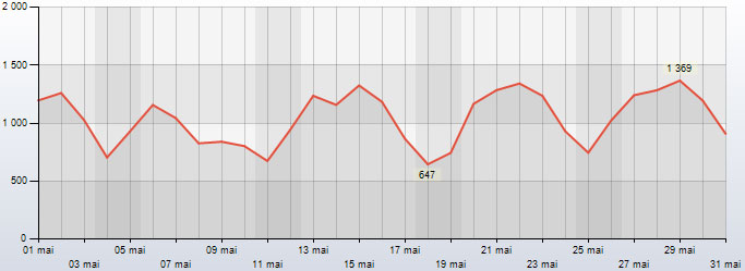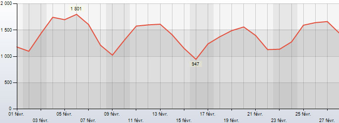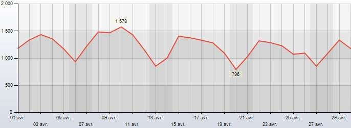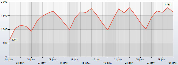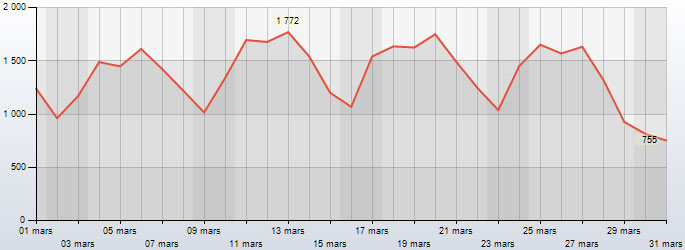 2013 (32'344 = 1043 vis./j.) Avril 2013 (36'440 = 1214 vis./j.) Mars 2013 (42'402 = 1367 vis./j.) Février 2013 (39'393 = 1406 vis./j.) Janvier 2013 (43'435 = 1397 vis./j.)